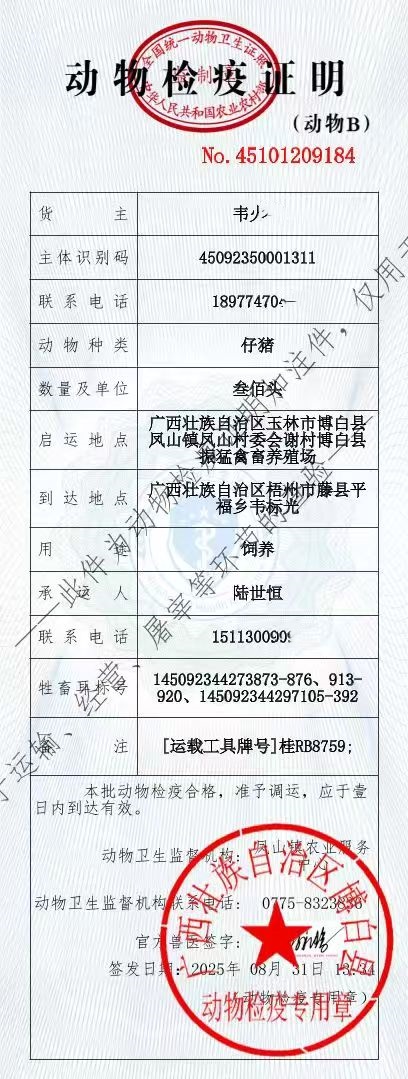 2025年9月1日黑猪苗350头投放桂林一代养户