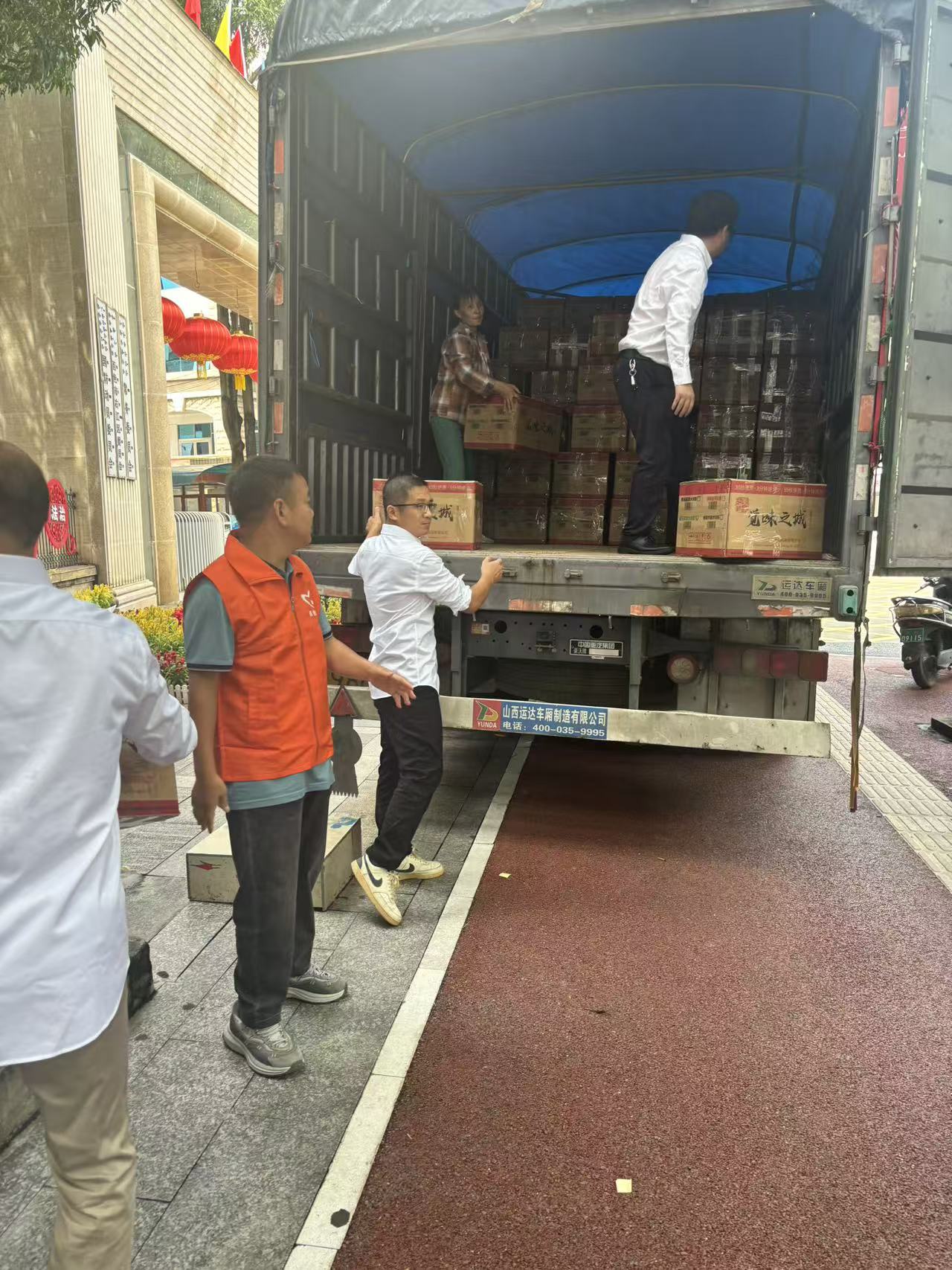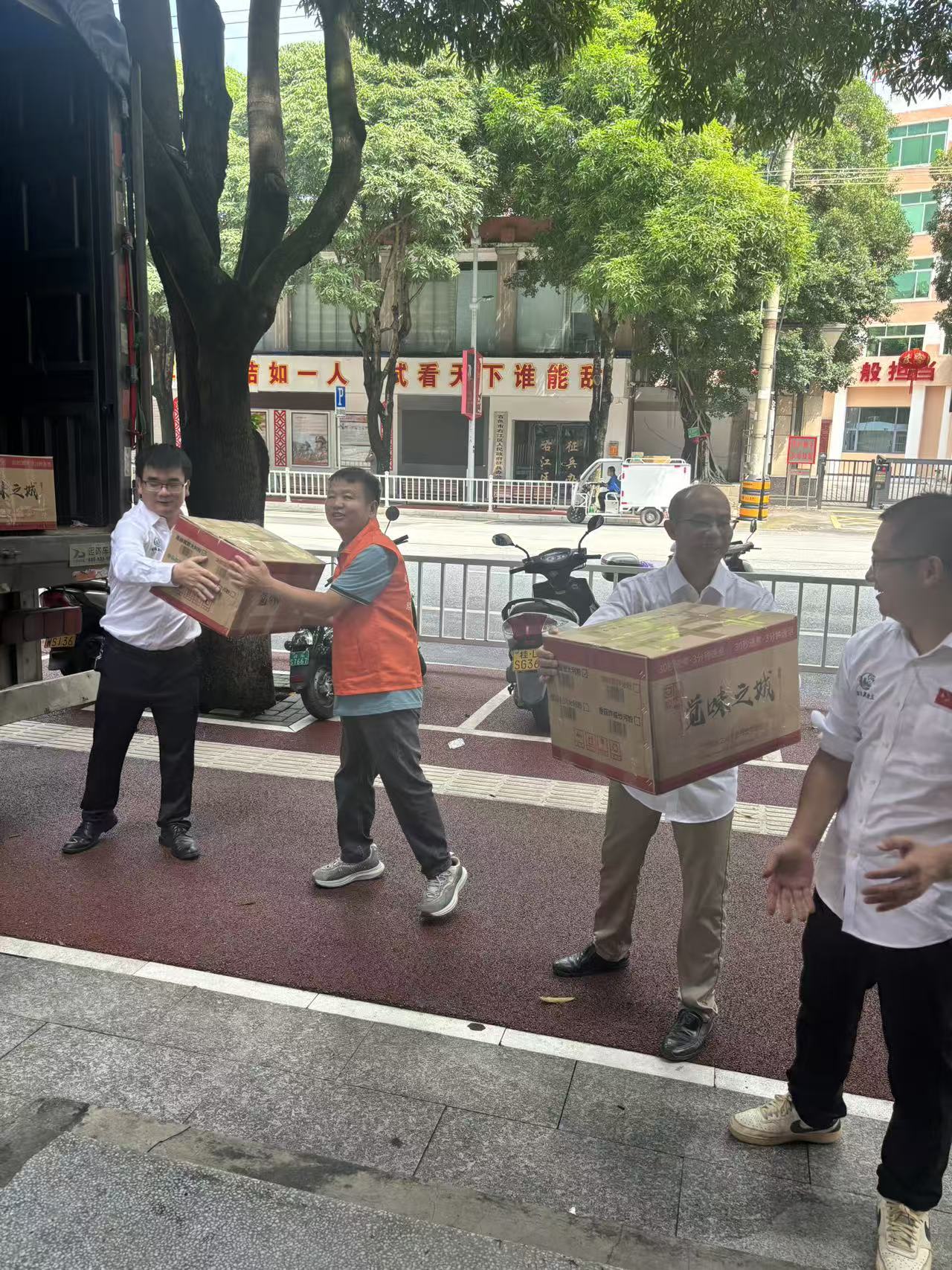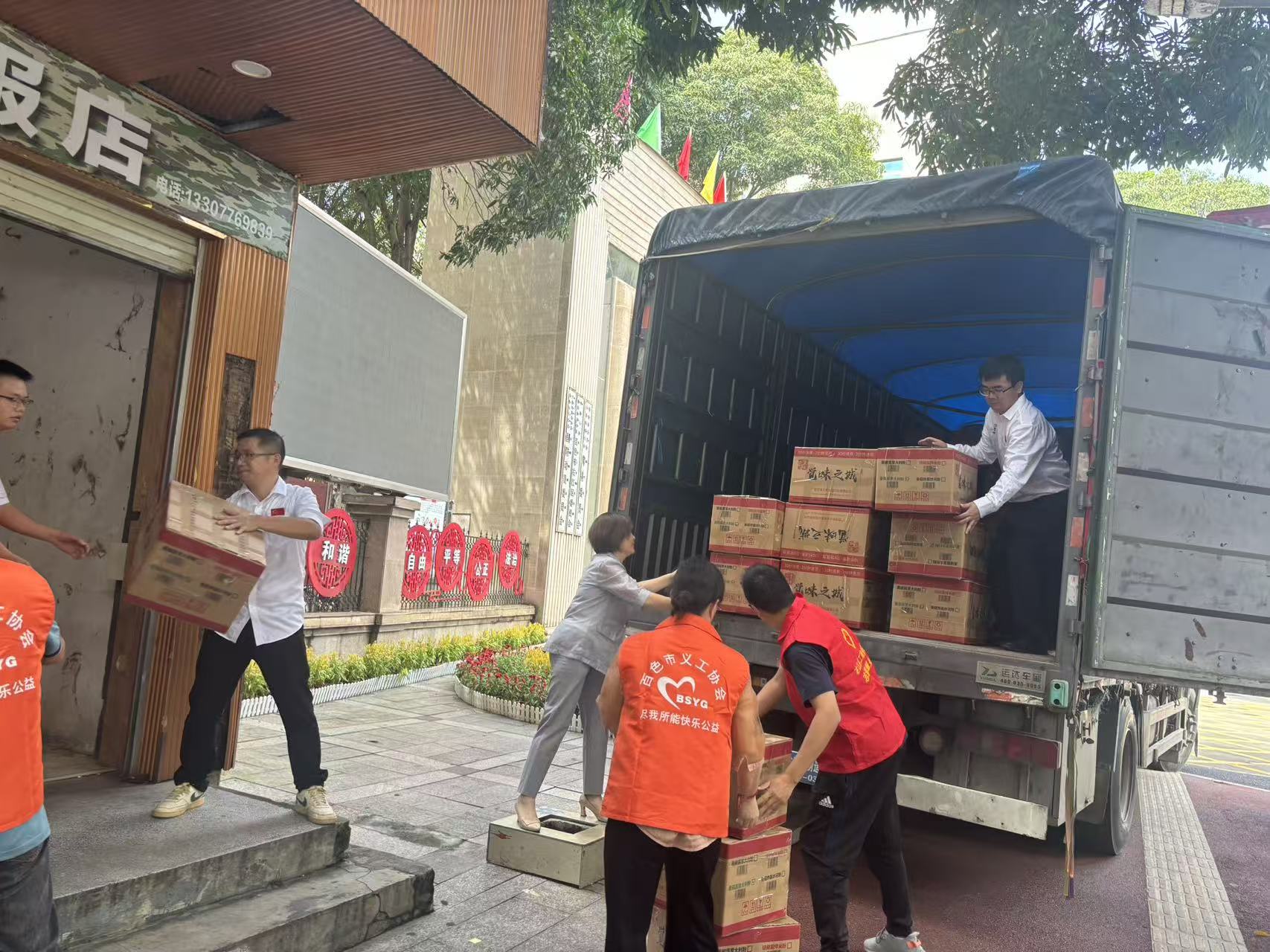 志愿者们默契配合,迅速将一箱箱螺蛳粉从车上卸下,妥善搬至临时堆放点,确保了救援物资的高效流转。