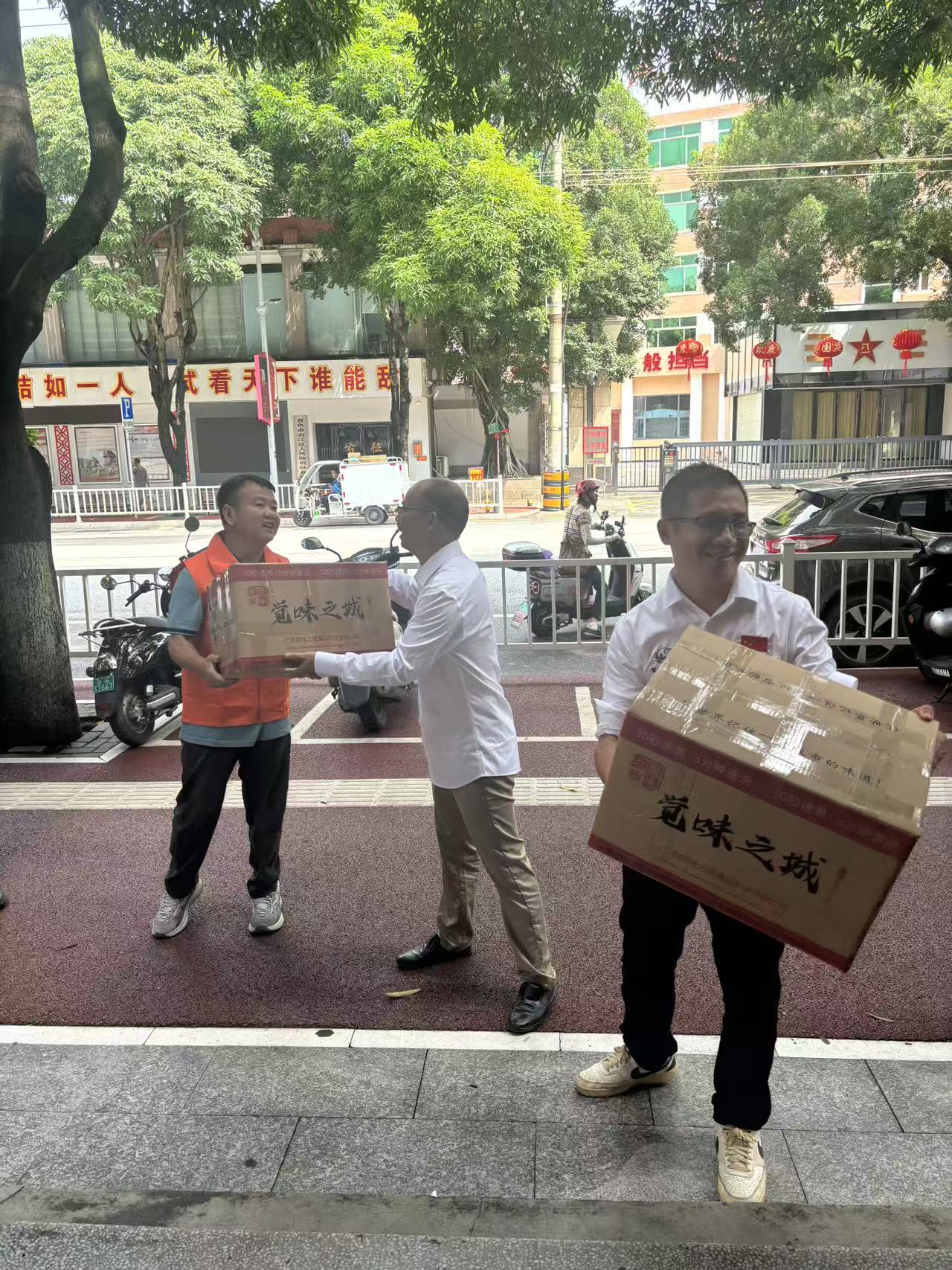 洪水无情,人间有爱。右江区政府的临时堆放点前,志愿者们接力传递的每一箱螺蛳粉,都承载着爱心企业对灾区的深切关怀。